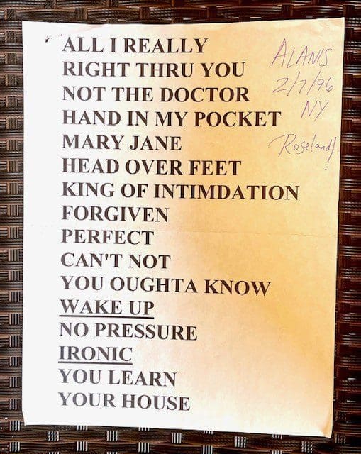 Here’s the set list from the second night of Alanis Morissette’s three-night stand at NYC’s Roseland (February 6, 7 and 8 in 1996) when Taylor Hawkins was in her touring band. As Alanis’ publicist back then, Mitch Schneider was there for all three nights. Says Mitch: “Taylor’s drumming style helped elevate Alanis’ live show to an arena level that was beyond the theaters she was performing at back then.” May Taylor rest in piece…