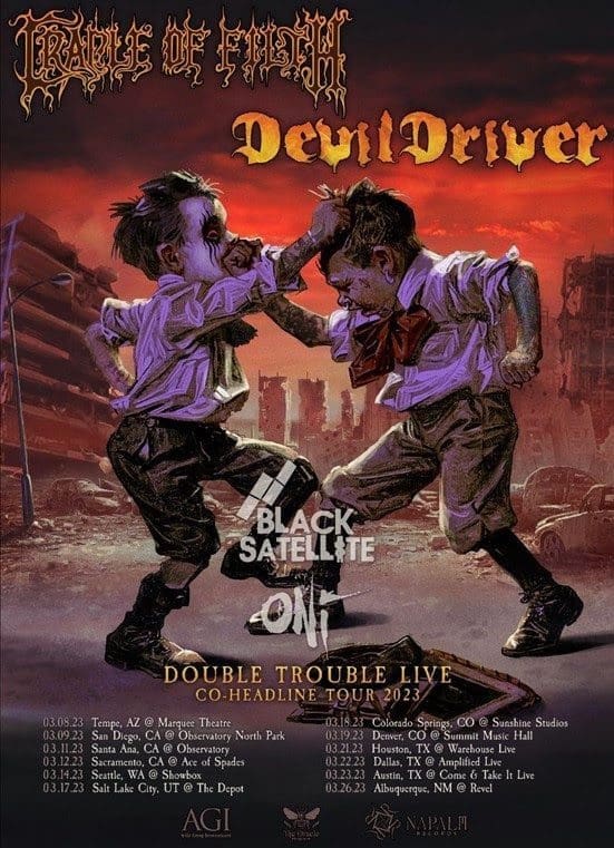 Black Satellite embarks on tour with co-headliners Cradle of Filth and DevilDriver beginning March 8, 2023 in Tempe, AZ. The first leg of the “Double Trouble Live” tour will visit several popular western and southern U.S. markets, coming to an end in Albuquerque, NM on March 26.