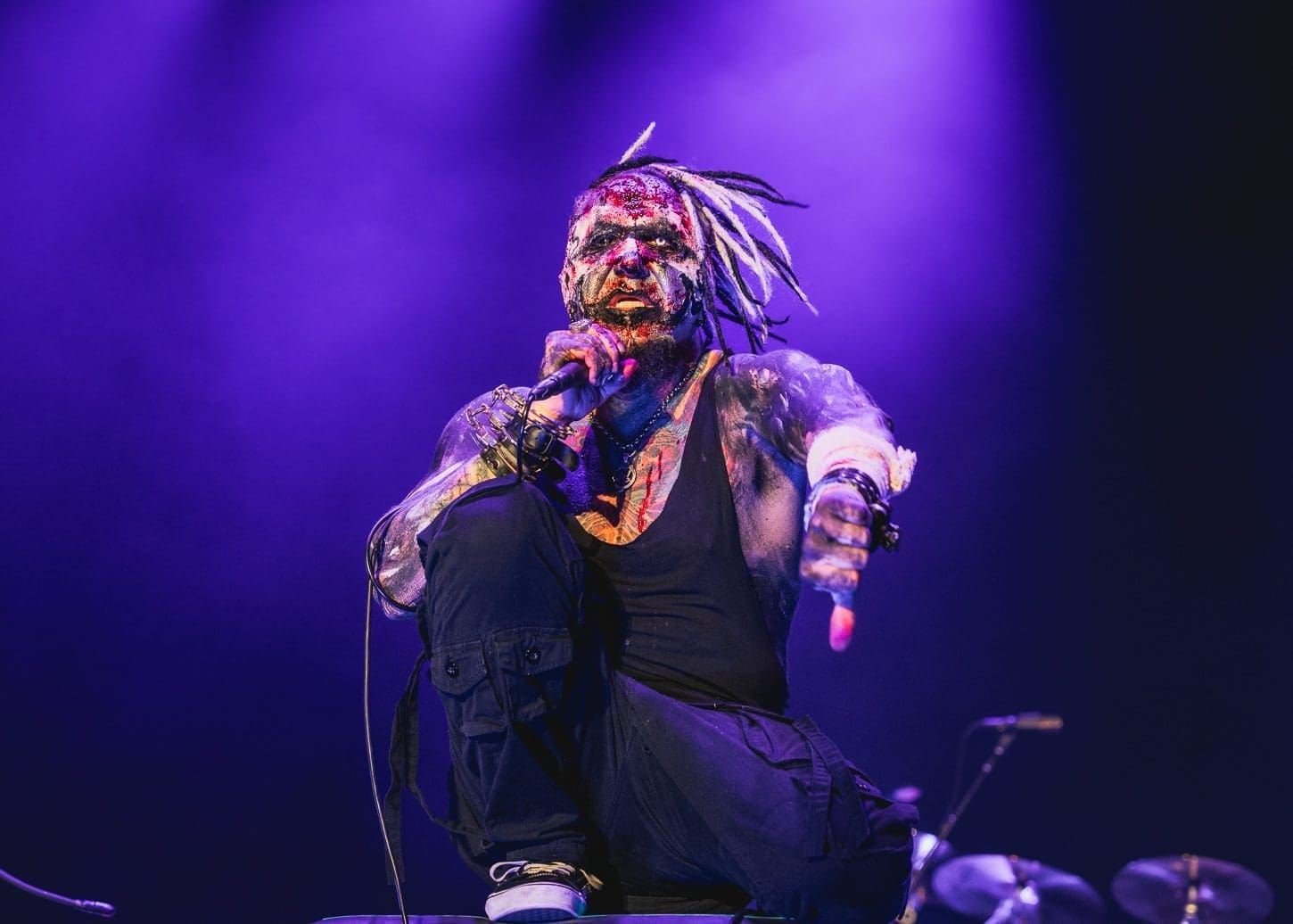 As the lights dimmed and the stage was set for Mudvayne, the excitement filled the rain soaked venue. The band’s entrance was met with thunderous applause and cheers. Mudvayne exploded onto the stage with “Dull Boy,” a signature track that immediately ignited the crowd. Frontman Chad Gray’s intense vocals and frenetic energy were on full display, captivating the audience from the get-go.