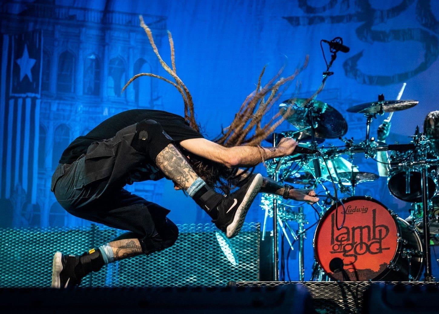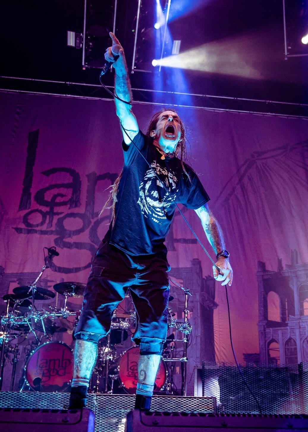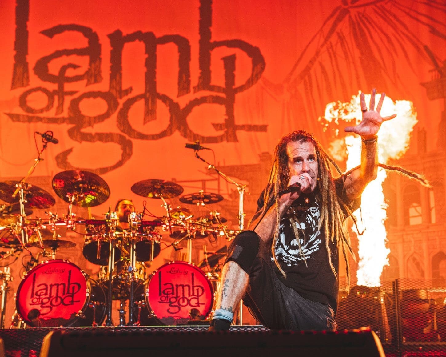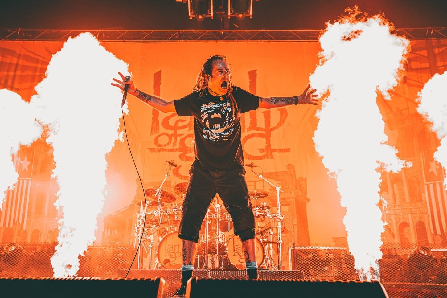 Third was the all mighty Lamb of God! Hailing from Virginia, this is one band that never disappoints. The anticipation that grows with the raising of the curtain that shields the crowd from the preparation of stage is palpable. There is no frontman in the heavy metal scene better than Randy Blythe. From the moment the kabuki drops, his incessant pacing and whipping of his dreads causes the fans energy to boil over. It could also be the incredible amount of pyro that Lamb of God uses! For me, there is something about “Walk With Me In Hell”, the 3rd song in the set, which bring things to a head. You can fill the energy building as the flames grow higher and higher and it is all topped off with Randy’s giant leap off of the drummer’s riser.