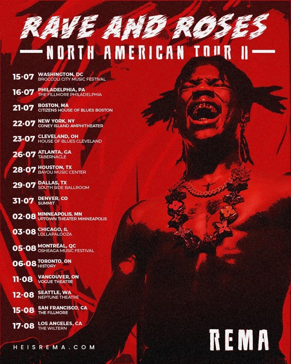 Off the back of the biggest Afrobeats song of 2022, and his breakout debut album Rave & Roses, Rema announces his highly-anticipated North American tour dates. The 14-stop tour produced by Live Nation and Duke Concept will feature support from Nigerian musician Victony and will kick off on July 15th in Washington D.C. with a performance at Broccoli City Music Festival, thereafter, making stops in New York City, Houston, Chicago, and more before wrapping in Los Angeles on August 17th.
