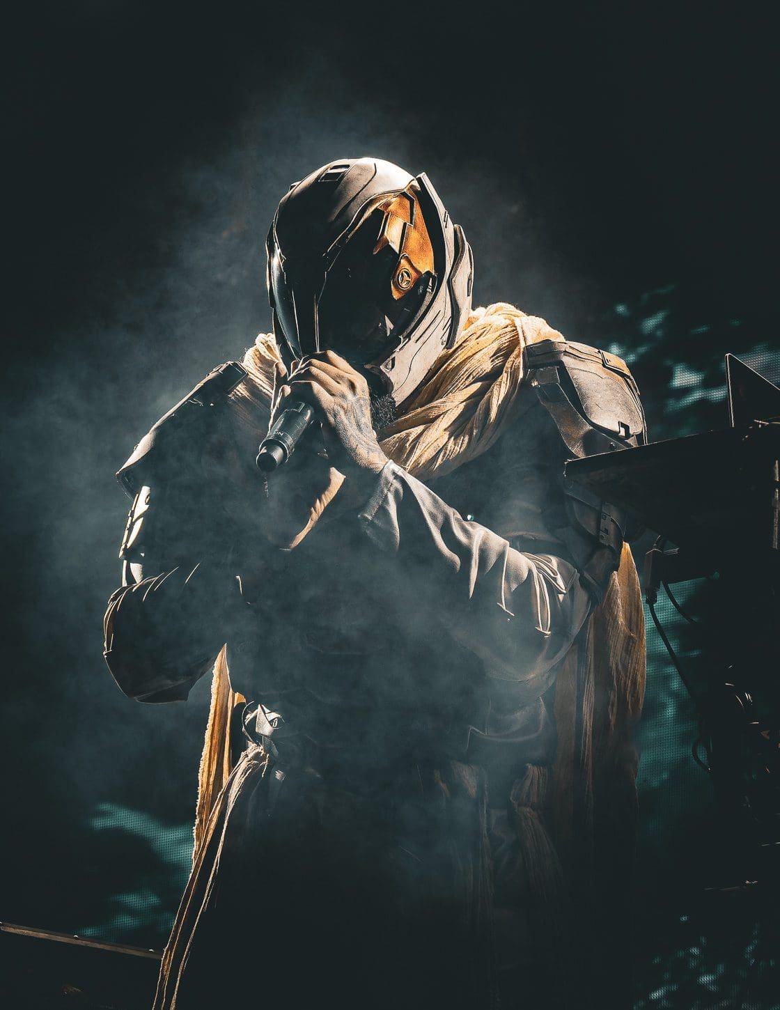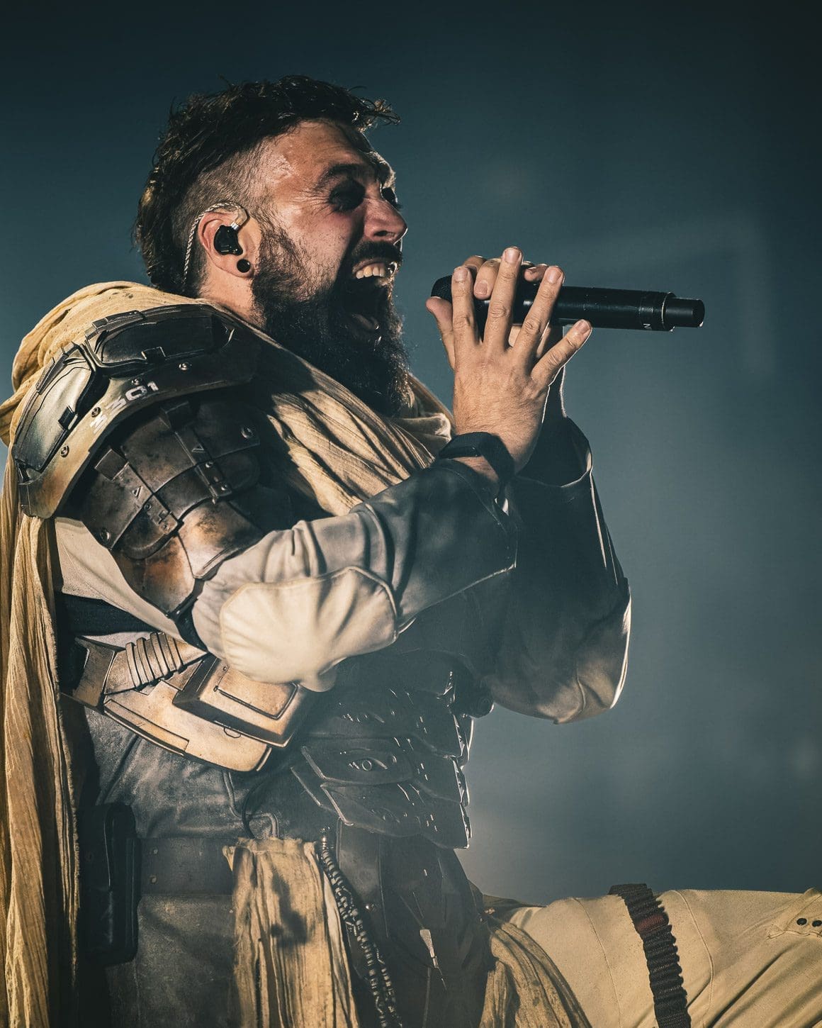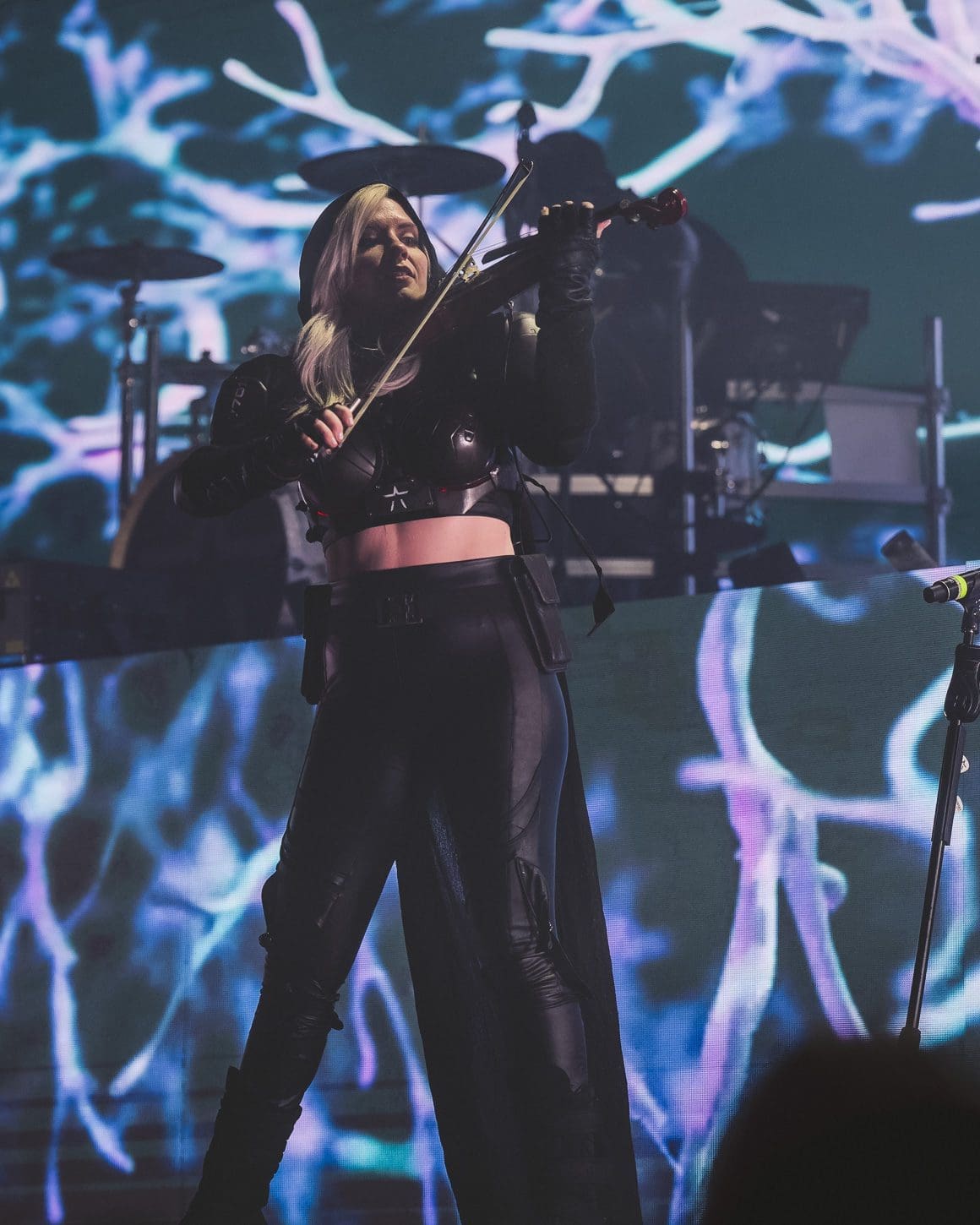 The band opened with “Unbecoming,” immediately thrusting the audience into their elaborate, sci-fi-inspired narrative. Frontman Dustin Bates, dressed in a black spacesuit, led the charge, his powerful voice cutting through the layered electronic beats and heavy guitar riffs. The combination of live instruments and pre-programmed electronic elements created a dense, cinematic soundscape that enveloped the audience. Bates’ commanding stage presence was matched by the band’s cohesion, each member playing with a precision that added to the futuristic aesthetic of the show.