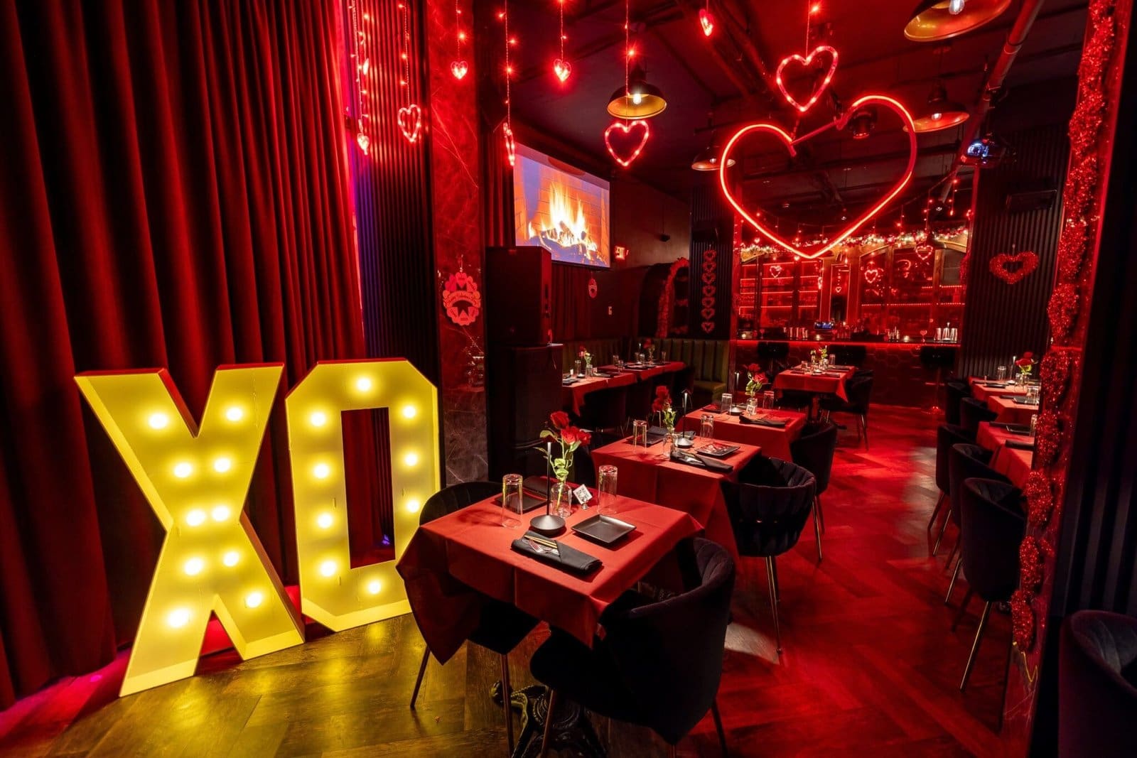 As you enter through a dimly lit hallway of hanging roses, you’ll step into a scene that feels like a movie set. Expect elegant red linens, twinkling lights, and plenty of photo opportunities, including a giant glowing heart aerial hoop for stunning aerial performances on select nights. The programming includes themed happy hours, DJ parties, karaoke, and elevated brunches, ensuring every visit feels fresh.